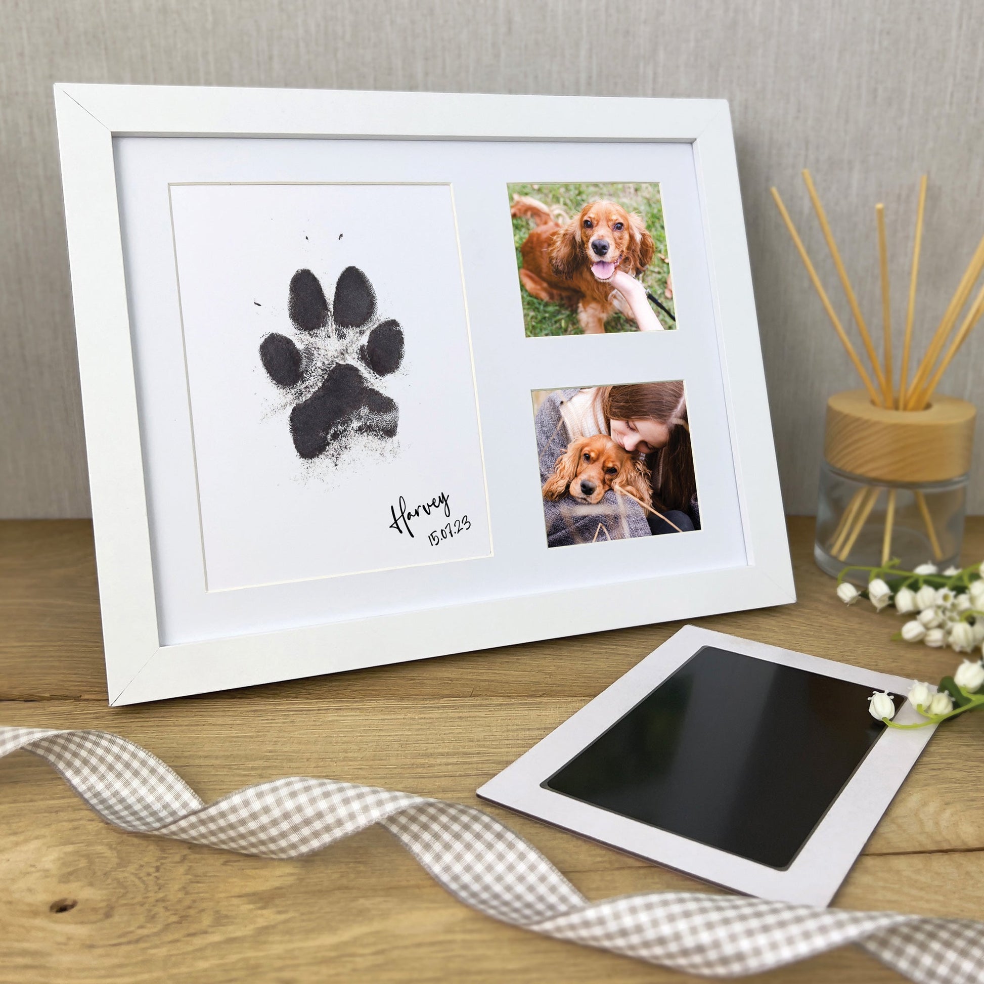 Display your animals paw print in the large aperture and then add their photos in the two smaller windows (7.1 x 6.5cm) with the included 3 aperture mount.